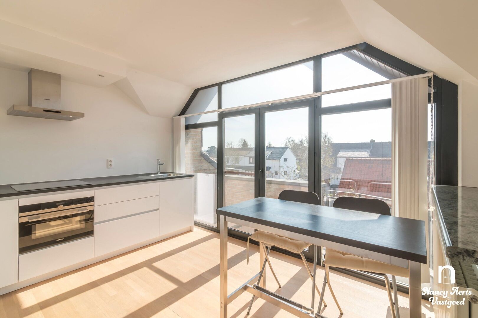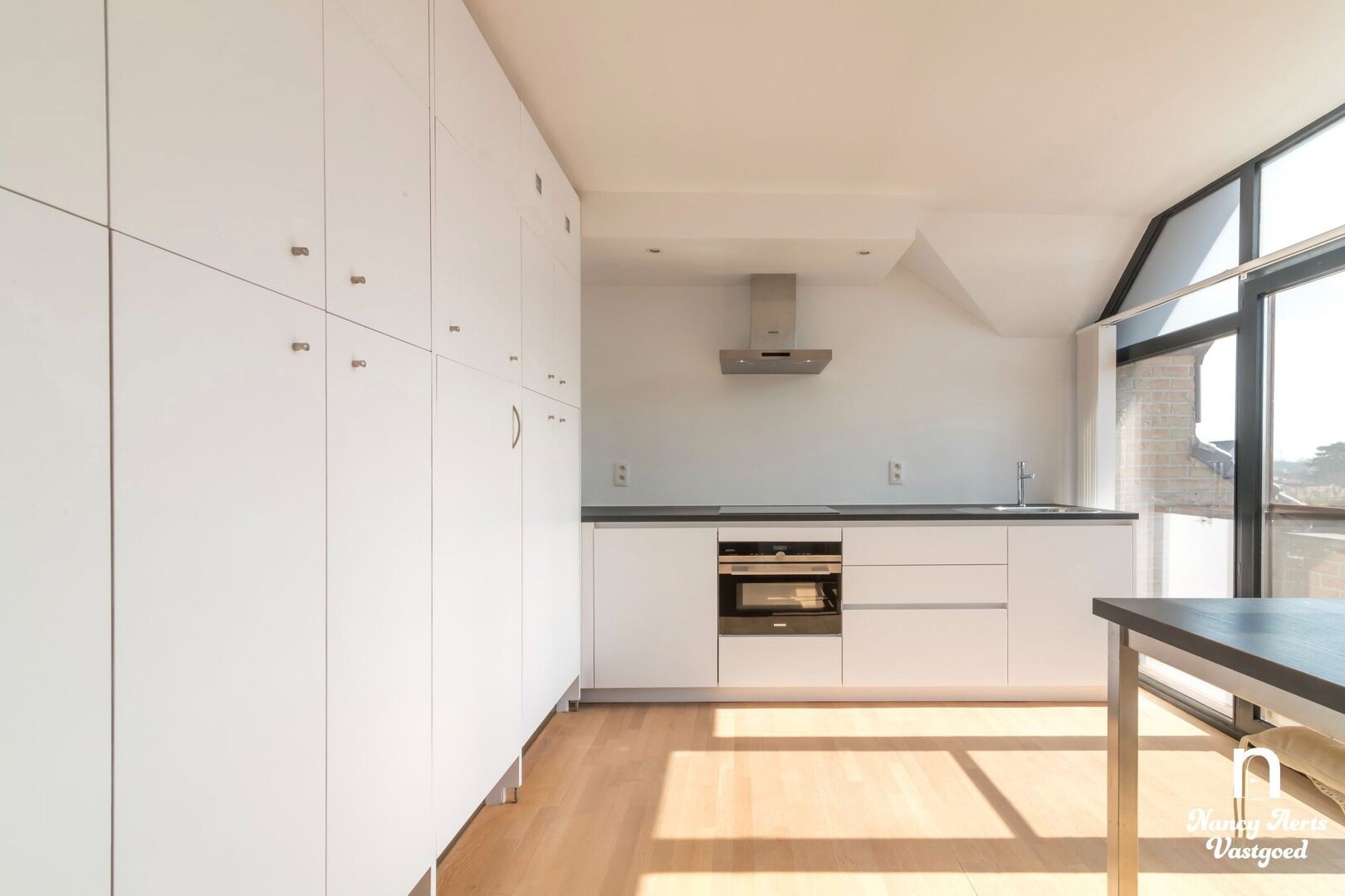 Bij het binnenkomen valt meteen de overvloed aan natuurlijk licht op. De grote raampartijen tot op de grond geven de leefruimte een open en aangenaam gevoel en sluiten mooi aan op de open keuken. Deze is praktisch ingericht met een volledige kastenwand en ontbijttafel, en biedt zicht op het zuidgerichte terras waar je de hele dag van de zon kan genieten.