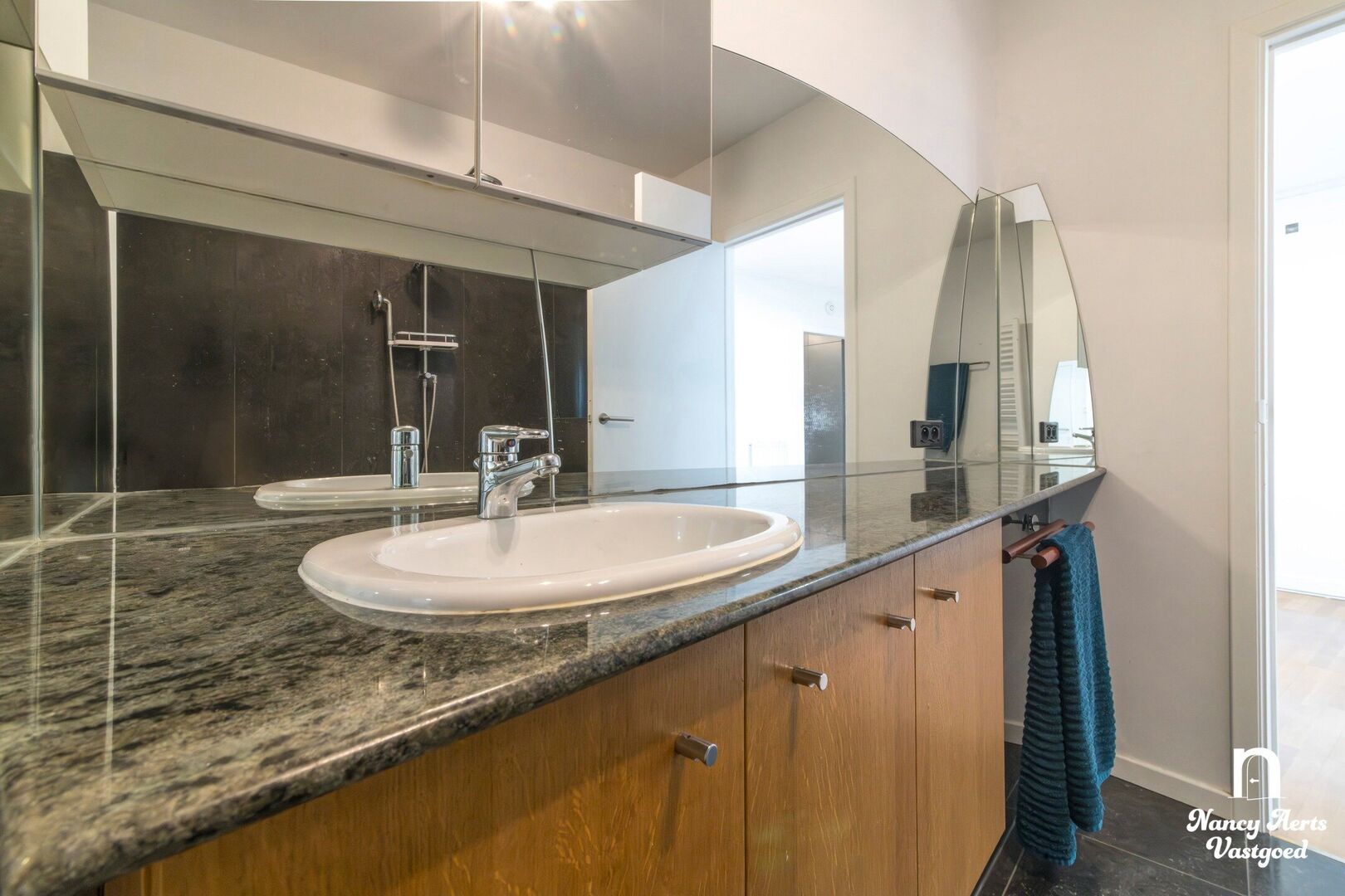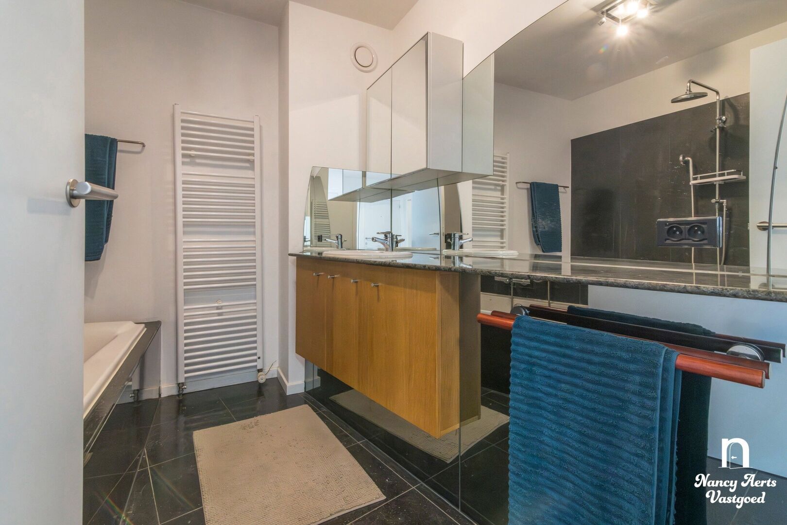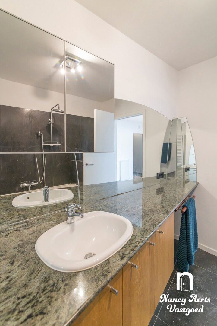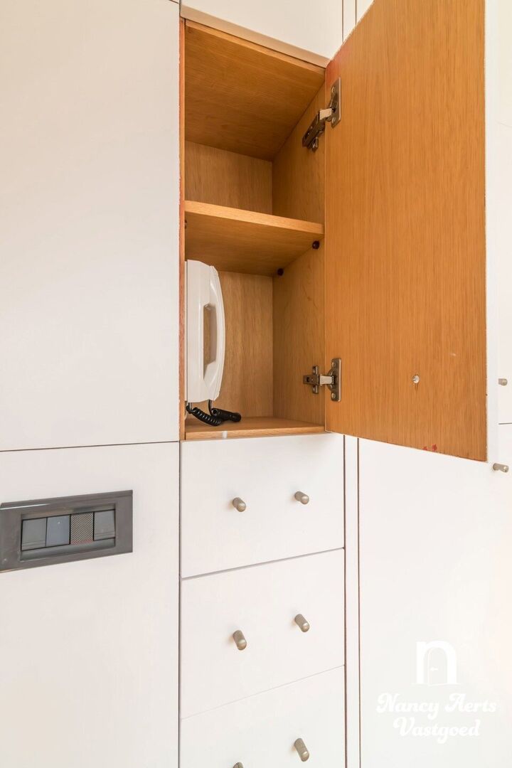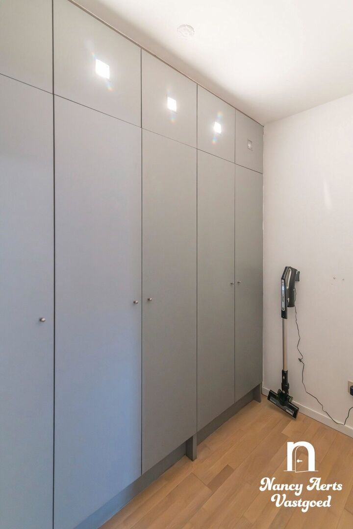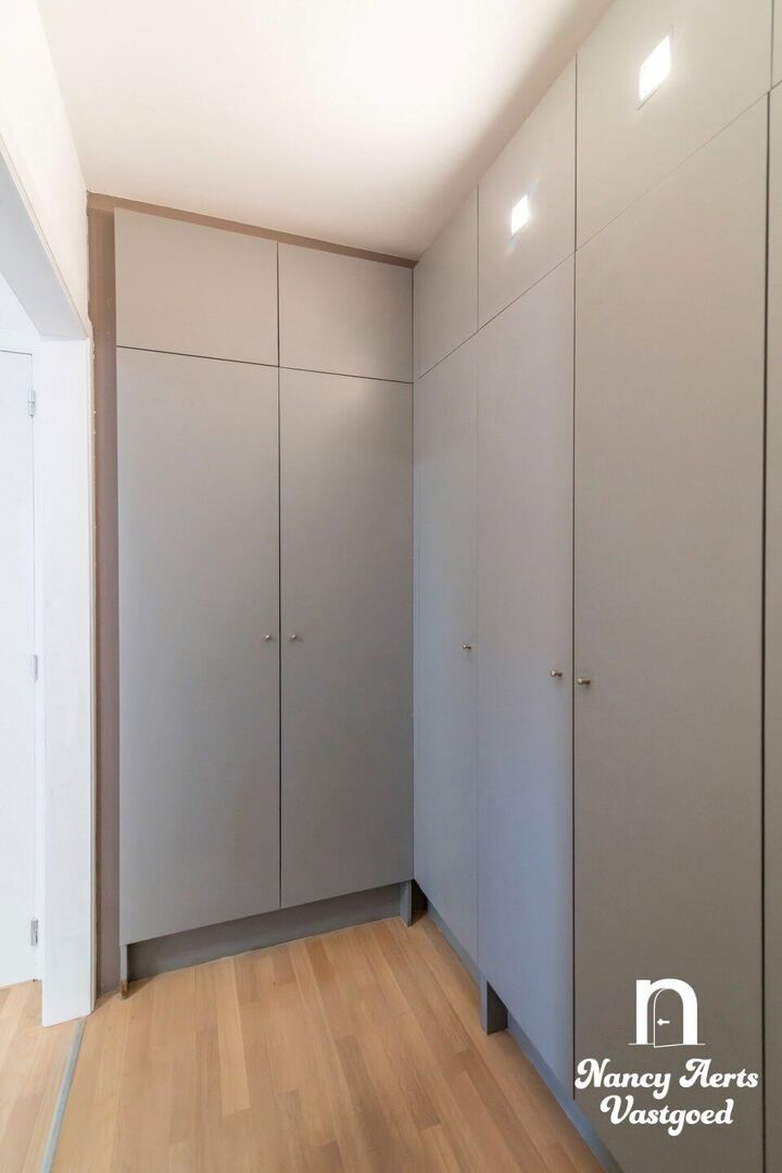 Het appartement beschikt over twee volwaardige slaapkamers en onderscheidt zich door de vele op maat gemaakte inbouwkasten die doorheen het volledige appartement werden voorzien. In de leefruimte, keuken, slaapkamers, badkamer en aparte dressing werd gekozen voor een uniforme en doordachte inrichting, wat zorgt voor rust, overzicht en optimaal gebruik van de ruimte.