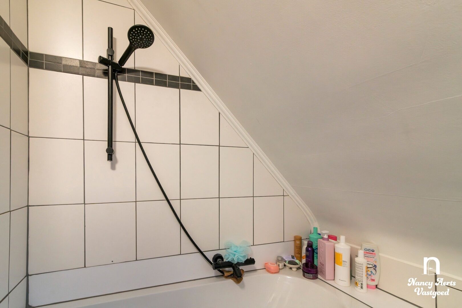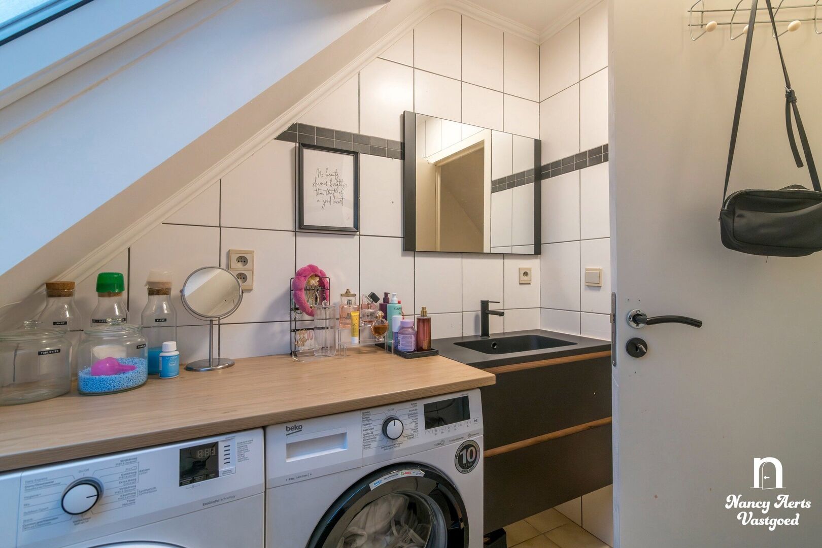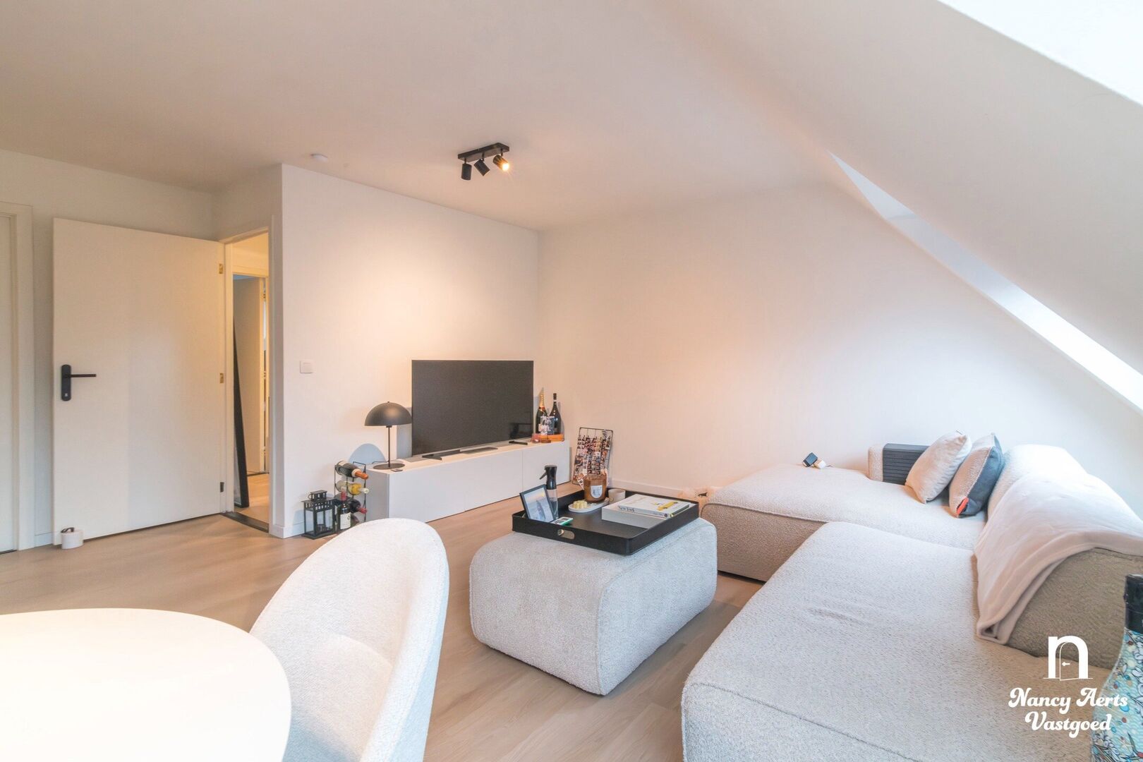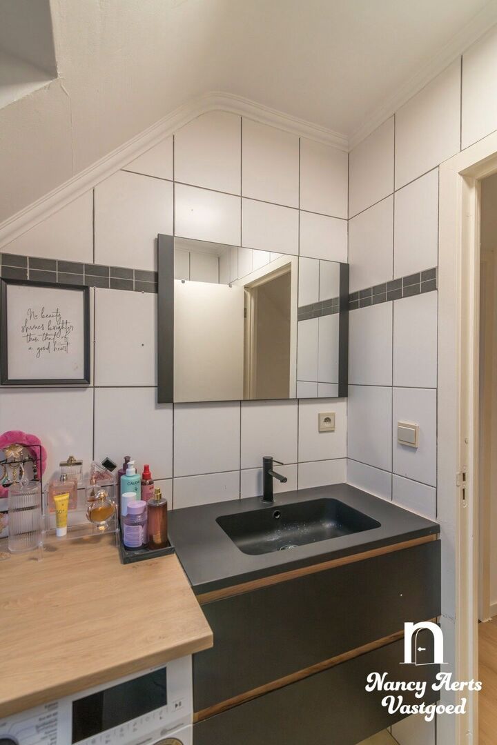 Op dezelfde verdieping bevindt zich een eerste slaapkamer met balkon, momenteel gebruikt als bureauruimte. In de woonkamer leidt een draaitrap naar de bovenverdieping, waar de tweede slaapkamer is ingericht met een volledige wand ingebouwde kasten. Daarnaast ligt de badkamer met een bad met douchefunctie, een lavabomeubel en ruimte voor wasmachine en droogkast.