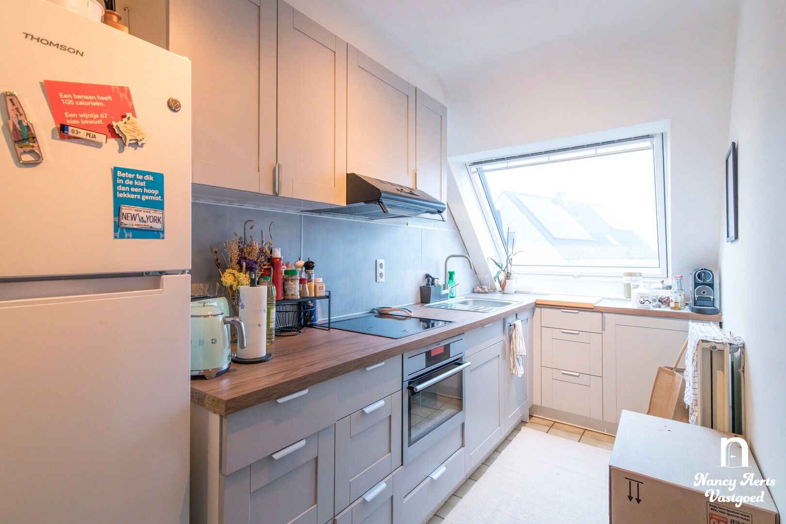 Dit duplexappartement heeft een aangename indeling en een gunstige ligging. Via de inkomhal met gastentoilet bereik je de ruime woonkamer, waar de aanwezige meubels bij de huur inbegrepen zijn. Er is plaats voor een comfortabele zithoek en een eettafel. Aansluitend ligt de keuken met een praktische berging.
