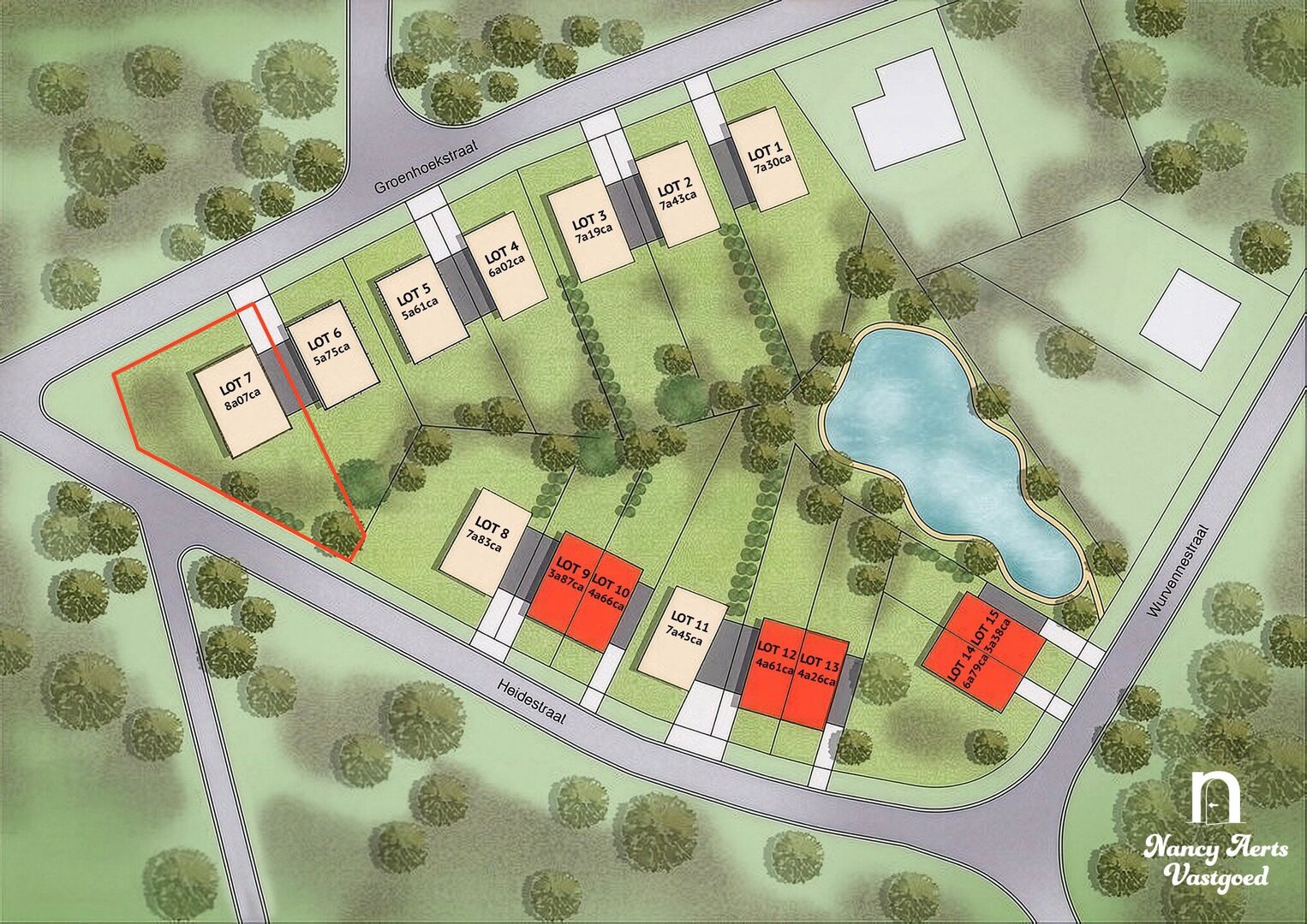 Lot 7 is bestemd voor open bebouwing en heeft een oppervlakte van 8a07ca. De voorgestelde moderne woning beschikt over een bewoonbare oppervlakte van 166 m². Op het gelijkvloers zijn een ruime eet- en zithoek, een bureau en een keuken met aansluitende berging voorzien. De verdieping telt 3 slaapkamers, waarvan één met dressing, en een badkamer met bad en/of douche.