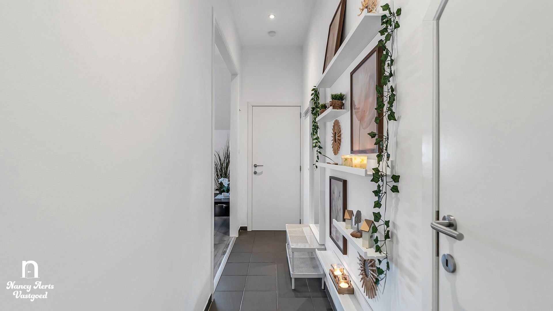 Via een trap in staal met houtaccenten bereik je de eerste verdieping. Het inkomhalletje vormt de overgang naar een leefruimte die meteen indruk maakt. De woonkamer strekt zich royaal uit en voelt licht en open aan, met aan de ene zijde een gezellige zithoek met tv en aan de andere zijde een keuken die uitblinkt in opbergruimte. Er is nog volop plaats voor een grote eettafel.