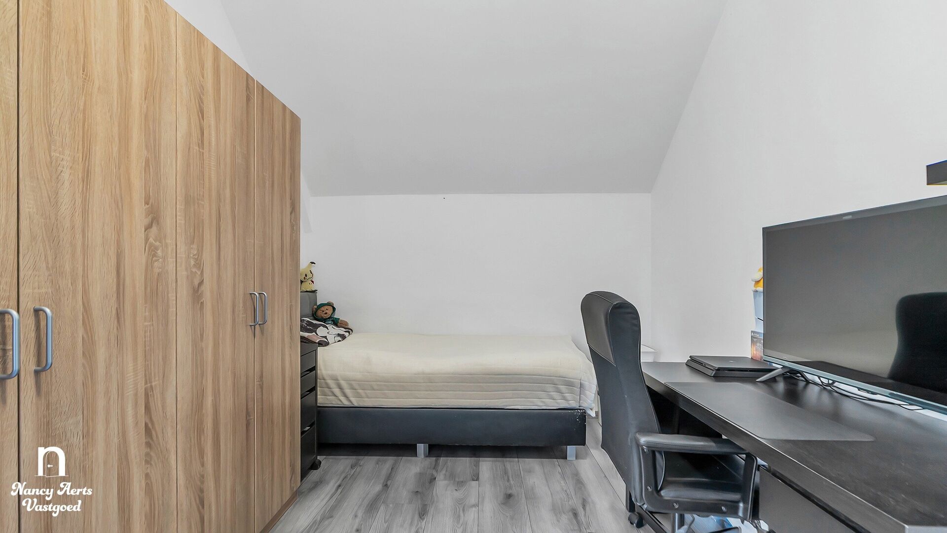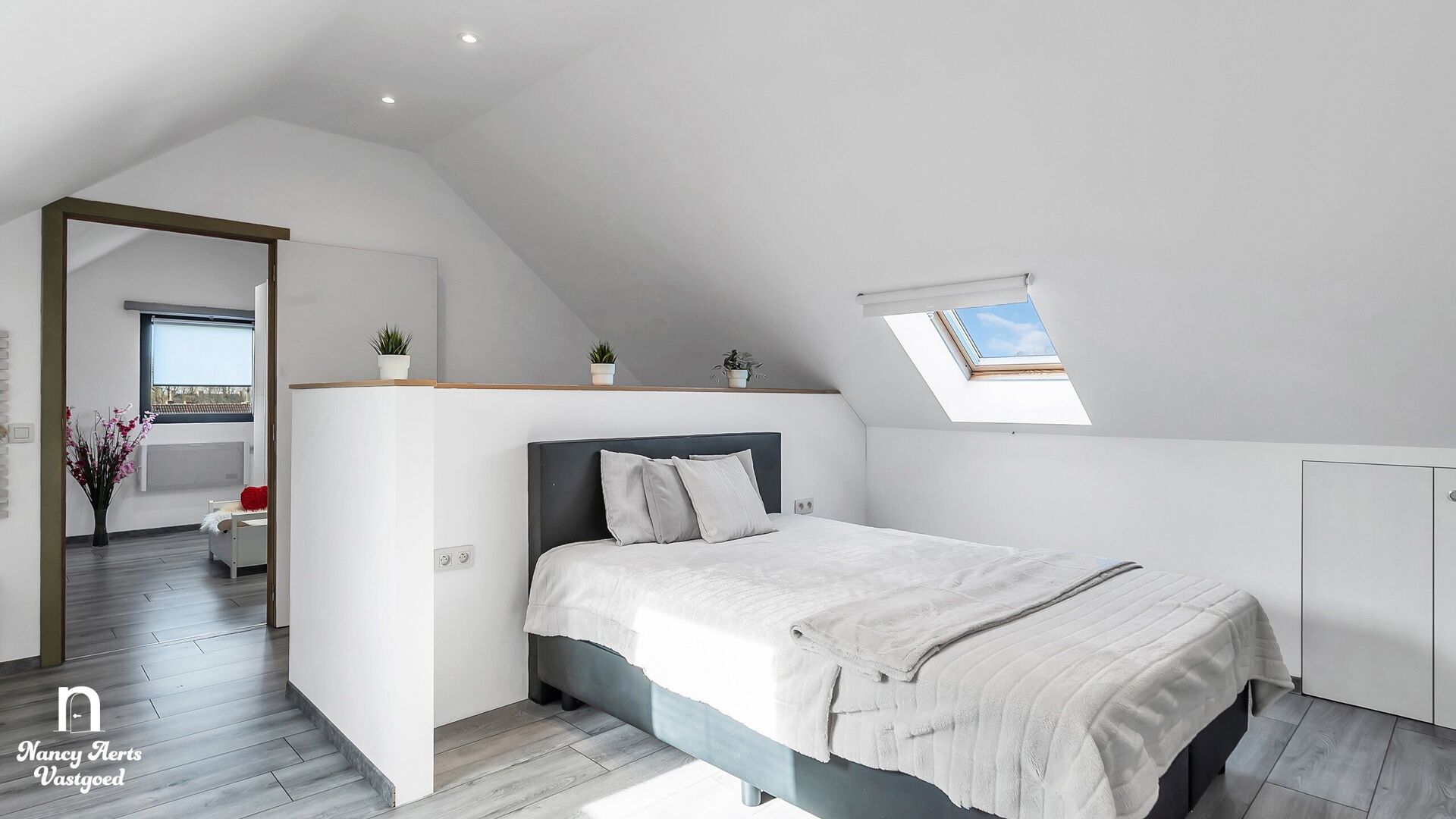 Een trap leidt naar de bovenste verdieping, waar zich de vierde slaapkamer bevindt. Deze ruimte heeft een eigen, charmant karakter en biedt bovendien plaats voor een bureauhoek die subtiel afgescheiden is. Aansluitend vind je een dressing en nog een extra kamer die perfect kan dienen als bureau of hobbyruimte. Ook hier werd gedacht aan extra opbergruimte, met een bijkomende zone waar momenteel kasten voorzien zijn.