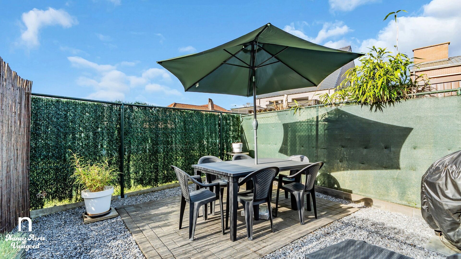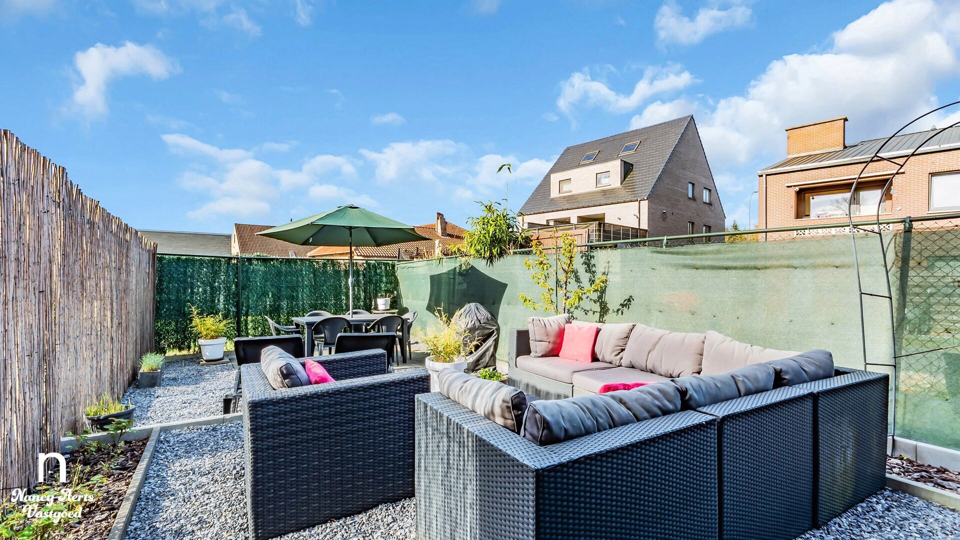 Buiten geniet je van een volledig omheinde tuin waar rust en privacy centraal staan. Er is voldoende ruimte voor een loungehoek en een terrastafel, terwijl de pergola zorgt voor een aangename overdekte plek om te ontspannen. De tuinberging biedt extra praktisch gemak en de wagen kan netjes onder de carport geplaatst worden. Vooraan de woning is er bovendien nog voldoende parkeergelegenheid.
